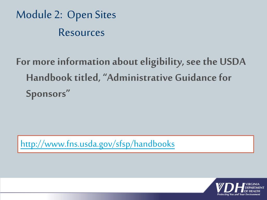 Module 2: Open Sites Resources • For more information about eligibility, see the USDA Handbook titled, “Administrative Guidance for Sponsors” http://www.fns.usda.gov/sfsp/handbooks