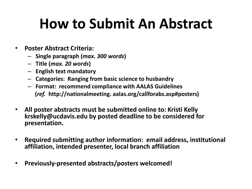 How to Submit An Abstract • Poster Abstract Criteria: • Single paragraph (max. 300 words) • Title (max. 20 words) • English text mandatory • Categories: Ranging from basic science to husbandry • Format: recommend compliance with AALAS Guidelines (ref. http://nationalmeeting. aalas.org/callforabs.asp#posters) • All poster abstracts must be submitted online to: Kristi Kelly krskelly@ucdavis.edu by posted deadline to be considered for presentation. • Required submitting author information: email address, institutional affiliation, intended presenter, local branch affiliation • Previously-presented abstracts/posters welcomed!