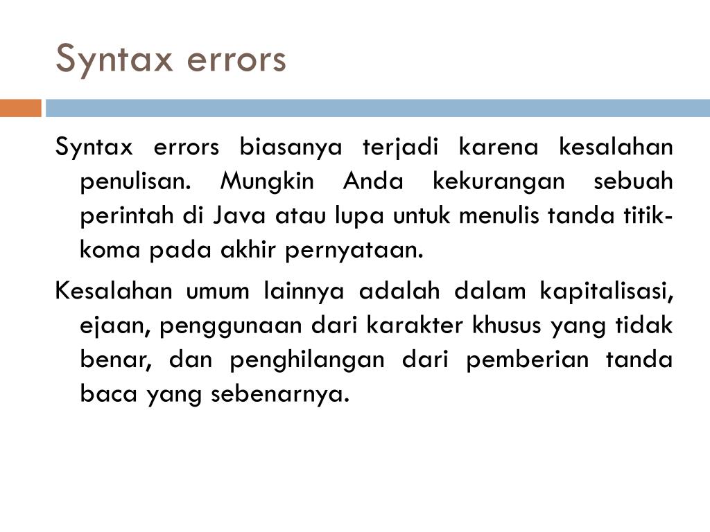 Syntax errors Syntax errors biasanyaterjadikarenakesalahanpenulisan. MungkinAndakekurangansebuahperintahdi Java ataulupauntukmenulistandatitik-komapadaakhirpernyataan. Kesalahanumumlainnyaadalahdalamkapitalisasi, ejaan, penggunaandarikarakterkhususyang tidakbenar, danpenghilangandaripemberiantandabacayang sebenarnya.