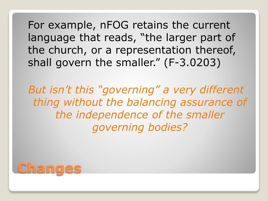 For example, nFOG retains the current language that reads, “the larger part of the church, or a representation thereof, shall govern the smaller.” (F-3.0203) But isn’t this “governing” a very different thing without the balancing assurance of the independence of the smaller governing bodies? Changes