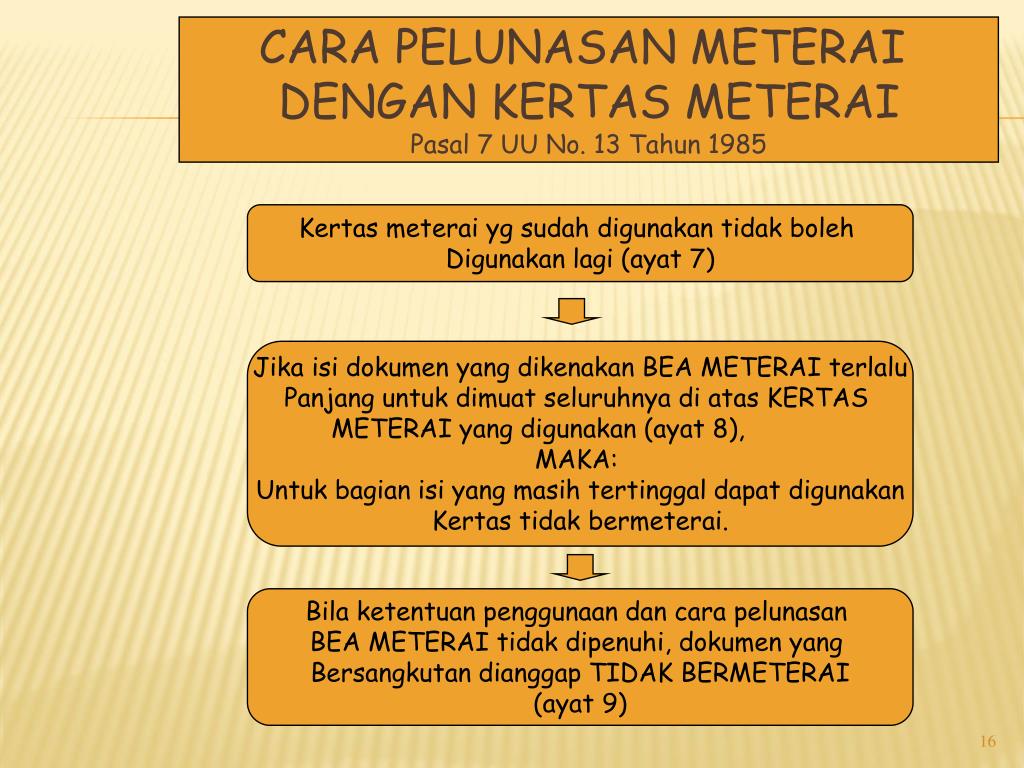CARA PELUNASAN METERAI DENGAN KERTAS METERAIPasal 7 UU No. 13 Tahun 1985 Kertas meterai yg sudah digunakan tidak boleh Digunakan lagi (ayat 7) Jika isi dokumen yang dikenakan BEA METERAI terlalu Panjang untuk dimuat seluruhnya di atas KERTAS METERAI yang digunakan (ayat 8), MAKA: Untuk bagian isi yang masih tertinggal dapat digunakan Kertas tidak bermeterai. Bila ketentuan penggunaan dan cara pelunasan BEA METERAI tidak dipenuhi, dokumen yang Bersangkutan dianggap TIDAK BERMETERAI (ayat 9)