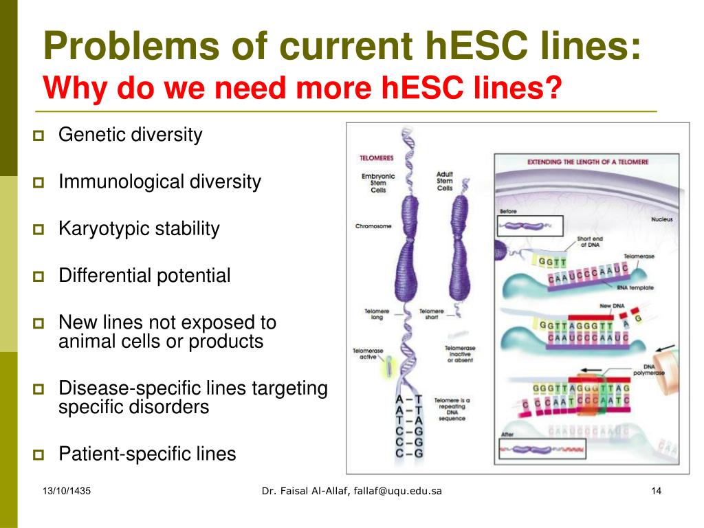 Problems of current hESC lines:Why do we need more hESC lines? • Genetic diversity • Immunological diversity • Karyotypic stability • Differential potential • New lines not exposed to animal cells or products • Disease-specific lines targeting specific disorders • Patient-specific lines Dr. Faisal Al-Allaf, fallaf@uqu.edu.sa