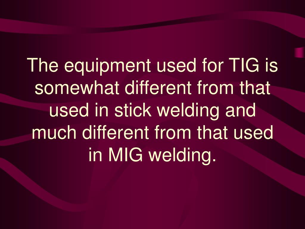 The equipment used for TIG is somewhat different from that used in stick welding and much different from that used in MIG welding.