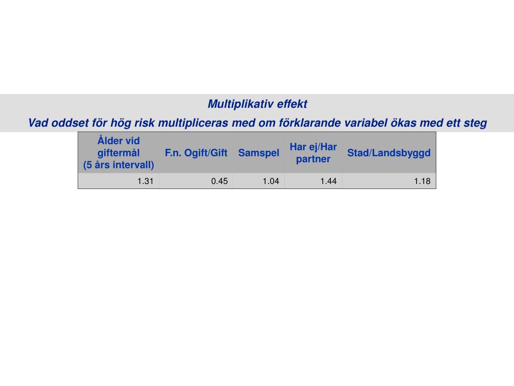 Multiplikativ effekt Vad oddset för hög risk multipliceras med om förklarande variabel ökas med ett steg Ålder vidgiftermål(5 års intervall) F.n. Ogift/Gift Samspel Har ej/Harpartner Stad/Landsbyggd 1.31 0.45 1.04 1.44 1.18