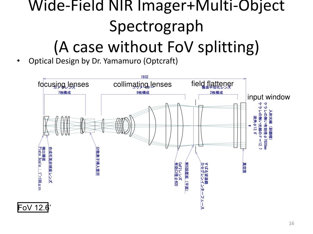 Wide-Field NIR Imager+Multi-Object Spectrograph(A case without FoV splitting) • Optical Design by Dr. Yamamuro (Optcraft) field flattener focusing lenses collimating lenses input window FoV 12.6’