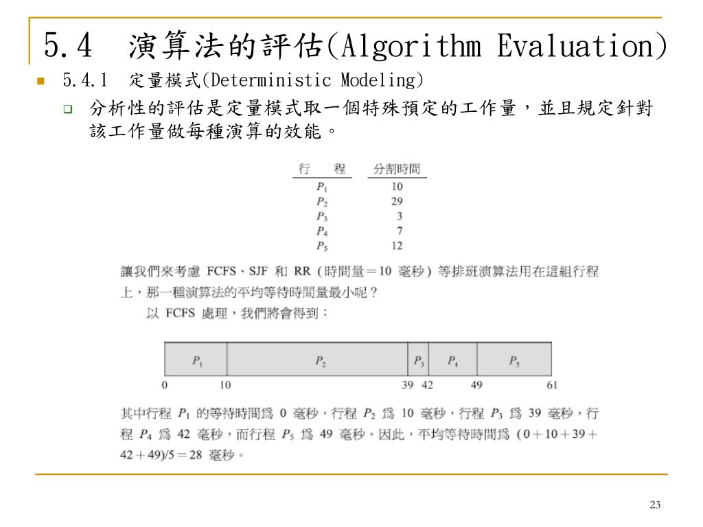 5.4 演算法的評估(Algorithm Evaluation) • 5.4.1 定量模式(Deterministic Modeling) • 分析性的評估是定量模式取一個特殊預定的工作量,並且規定針對該工作量做每種演算的效能。