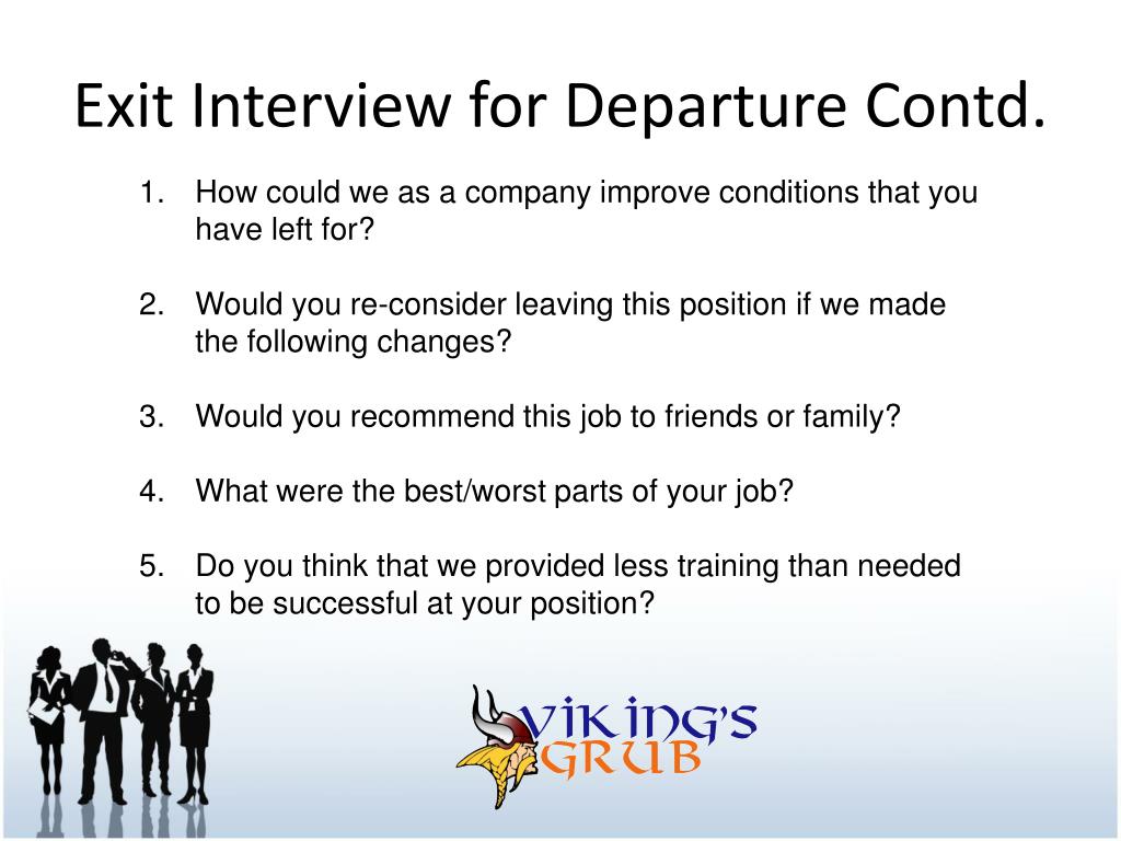 Exit Interview for Departure Contd. • How could we as a company improve conditions that you have left for? • Would you re-consider leaving this position if we made the following changes? • Would you recommend this job to friends or family? • What were the best/worst parts of your job? • Do you think that we provided less training than needed to be successful at your position?