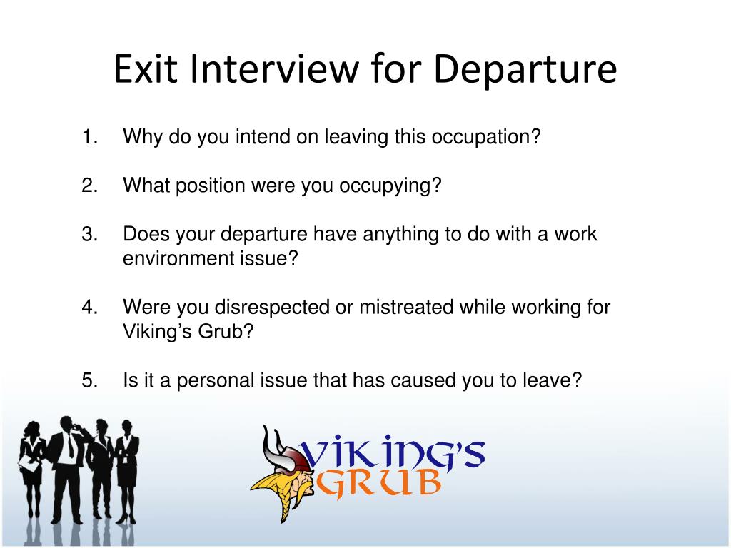 Exit Interview for Departure • Why do you intend on leaving this occupation? • What position were you occupying? • Does your departure have anything to do with a work environment issue? • Were you disrespected or mistreated while working for Viking’s Grub? • Is it a personal issue that has caused you to leave?