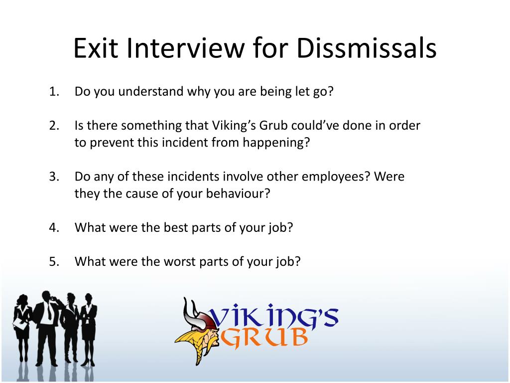 Exit Interview for Dissmissals • Do you understand why you are being let go? • Is there something that Viking’s Grub could’ve done in order to prevent this incident from happening? • Do any of these incidents involve other employees? Were they the cause of your behaviour? • What were the best parts of your job? • What were the worst parts of your job?