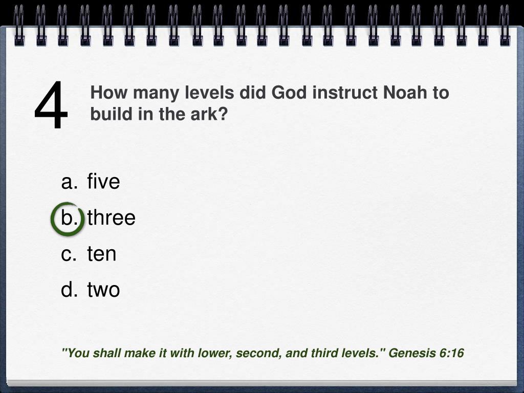 How many levels did God instruct Noah to build in the ark? 4 • five • three • ten • two "You shall make it with lower, second, and third levels." Genesis 6:16