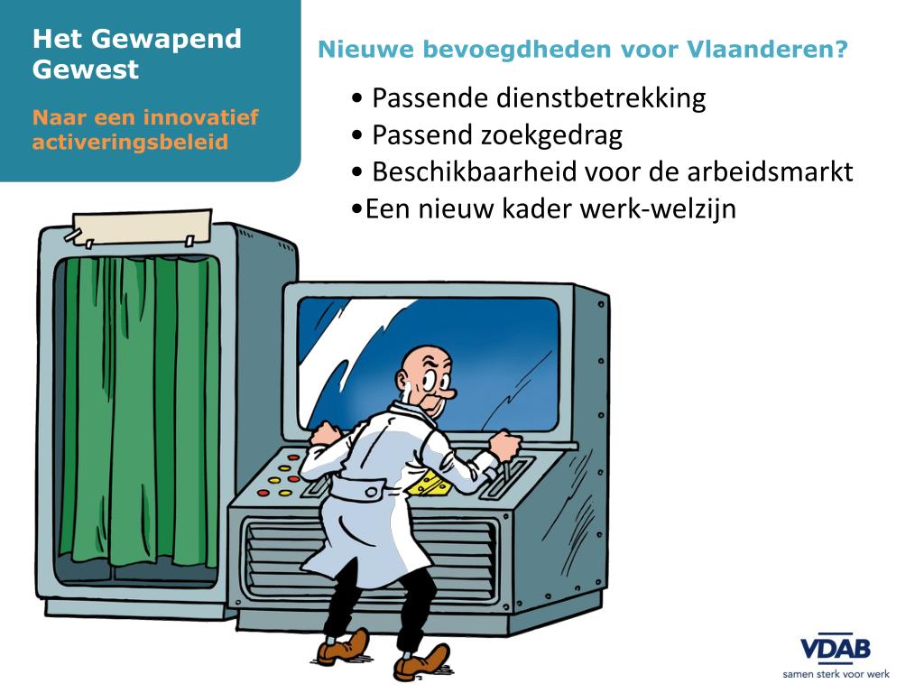 Het Gewapend Gewest Nieuwe bevoegdheden voor Vlaanderen? • Passende dienstbetrekking • Passend zoekgedrag • Beschikbaarheid voor de arbeidsmarkt • Een nieuw kader werk-welzijn Naar een innovatief activeringsbeleid