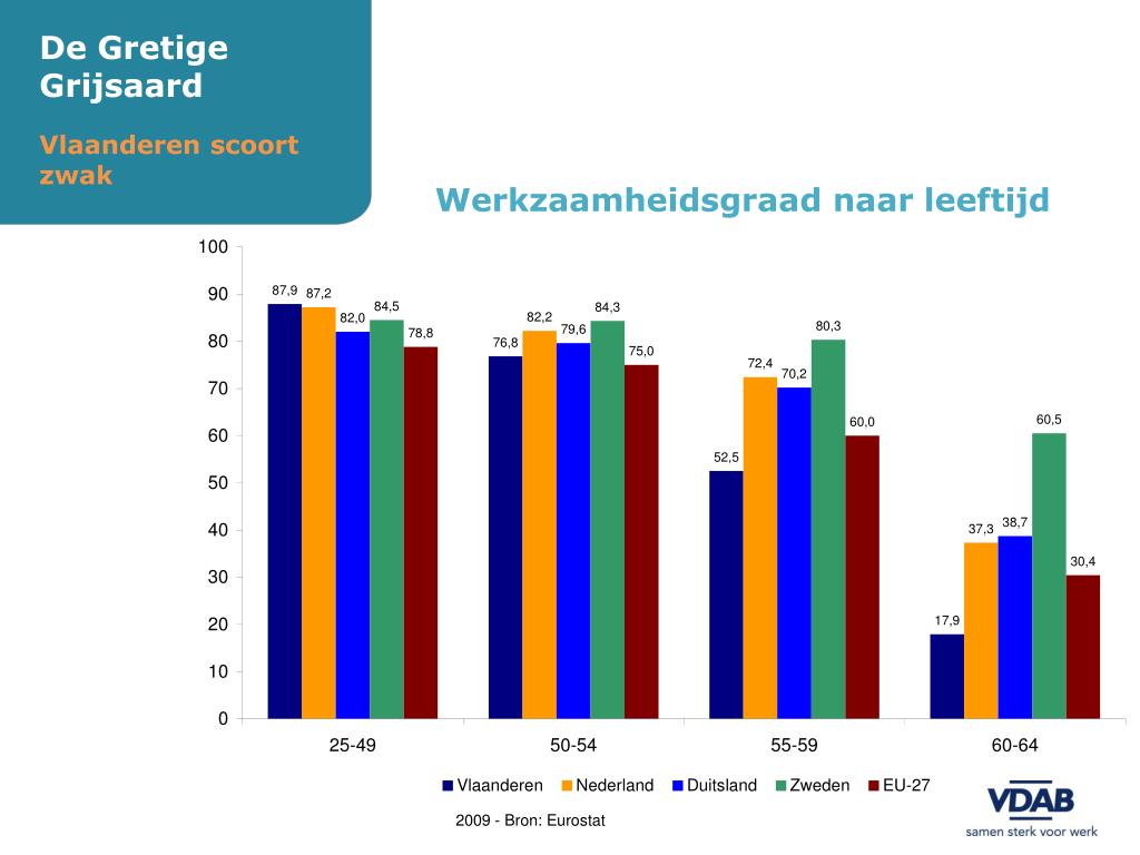De Gretige Grijsaard Vlaanderen scoort zwak Werkzaamheidsgraad naar leeftijd 2009 - Bron: Eurostat