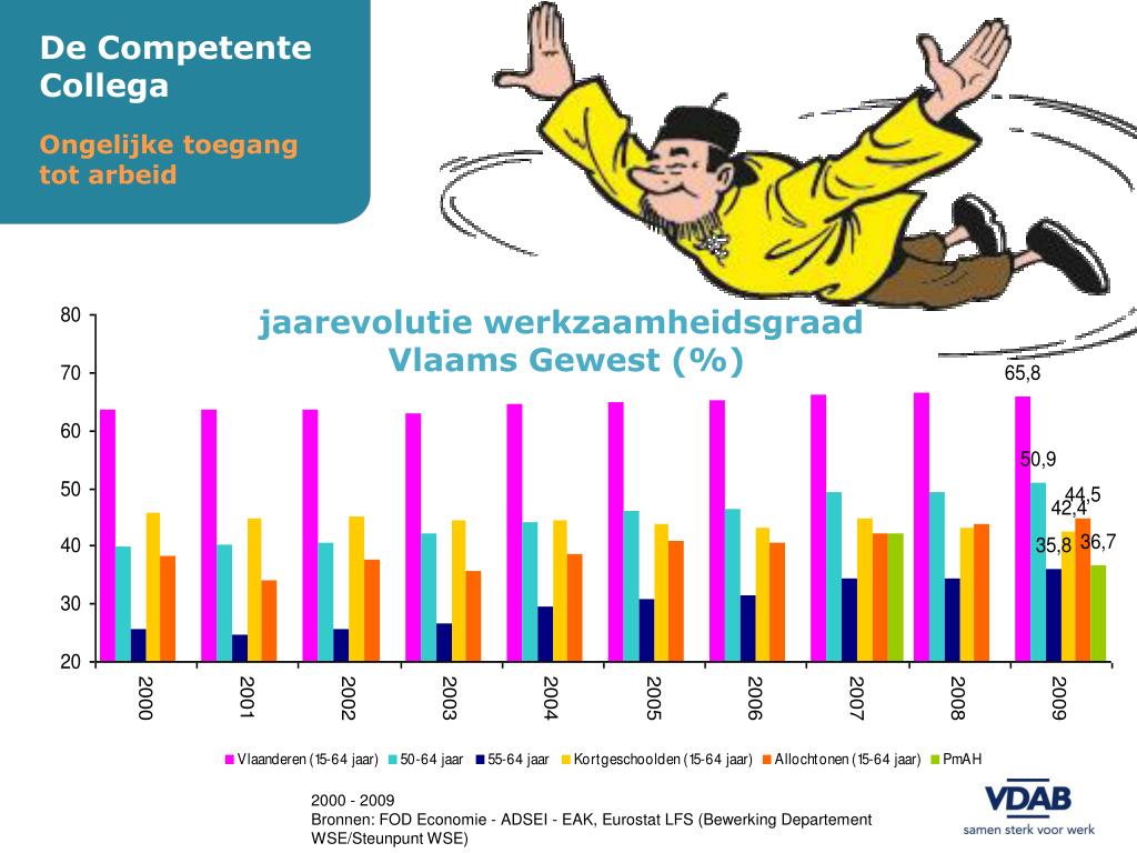 De Competente Collega Ongelijke toegang tot arbeid jaarevolutie werkzaamheidsgraad Vlaams Gewest (%) 2000 - 2009 Bronnen: FOD Economie - ADSEI - EAK, Eurostat LFS (Bewerking Departement WSE/Steunpunt WSE)