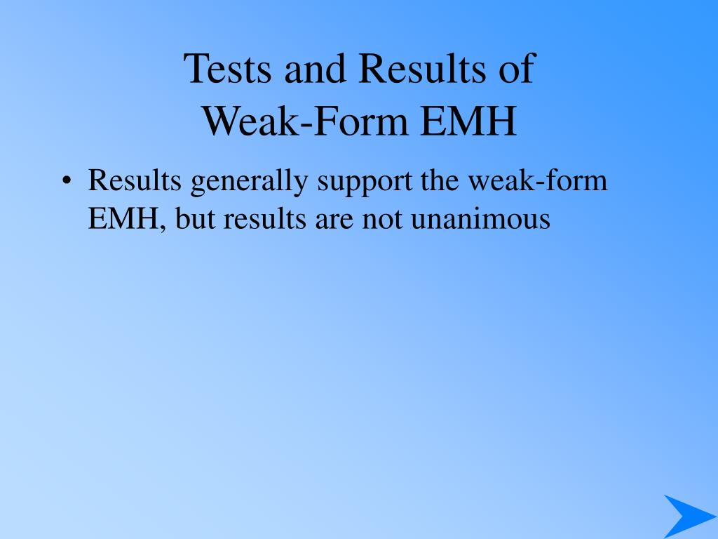 Tests and Results of Weak-Form EMH • Results generally support the weak-form EMH, but results are not unanimous