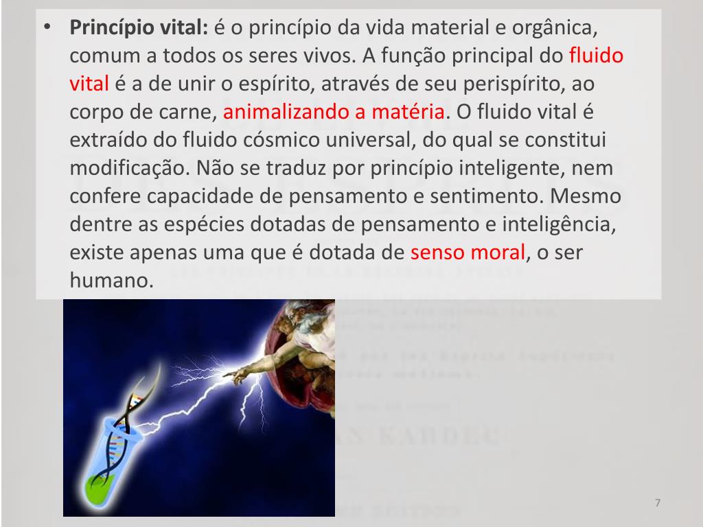 Princípio vital: é o princípio da vida material e orgânica, comum a todos os seres vivos. A função principal do fluido vital é a de unir o espírito, através de seu perispírito, ao corpo de carne, animalizando a matéria. O fluido vital é extraído do fluido cósmico universal, do qual se constitui modificação. Não se traduz por princípio inteligente, nem confere capacidade de pensamento e sentimento. Mesmo dentre as espécies dotadas de pensamento e inteligência, existe apenas uma que é dotada de senso moral, o ser humano.