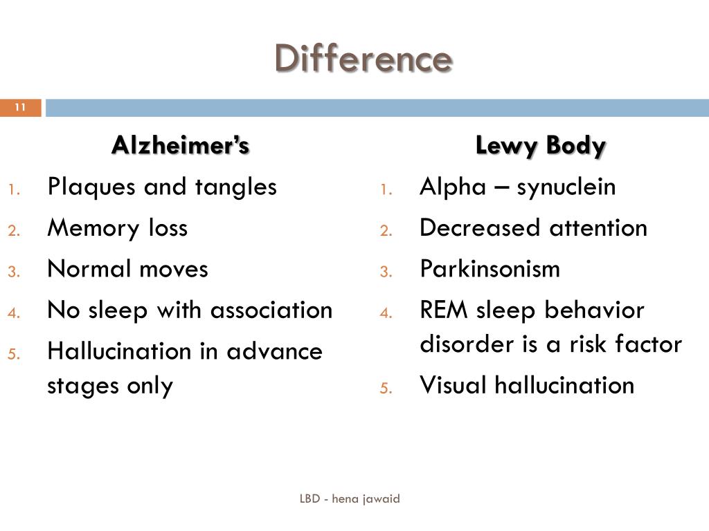 Difference Alzheimer’s • Plaques and tangles • Memory loss • Normal moves • No sleep with association • Hallucination in advance stages only Lewy Body • Alpha – synuclein • Decreased attention • Parkinsonism • REM sleep behavior disorder is a risk factor • Visual hallucination LBD - henajawaid