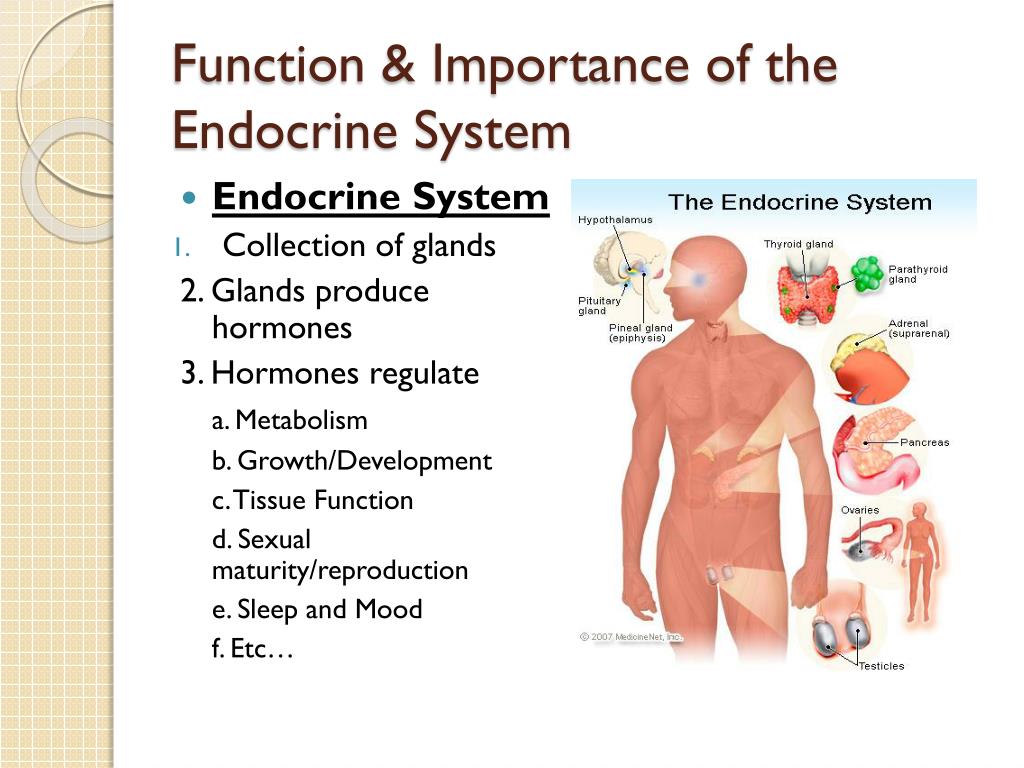 Function & Importance of the Endocrine System • Endocrine System • Collection of glands 2. Glands produce hormones 3. Hormones regulate a. Metabolism b. Growth/Development c. Tissue Function d. Sexual maturity/reproduction e. Sleep and Mood f. Etc…