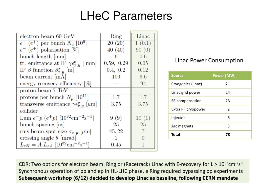 Linac Power Consumption LHeC Parameters CDR: Two options for electron beam: Ring or (Racetrack) Linac with E-recovery for L > 1033cm-2s-1 Synchronous operation of pp and ep in HL-LHC phase. e Ring required bypassing pp experiments Subsequent workshop (6/12) decided to develop Linac as baseline, following CERN mandate