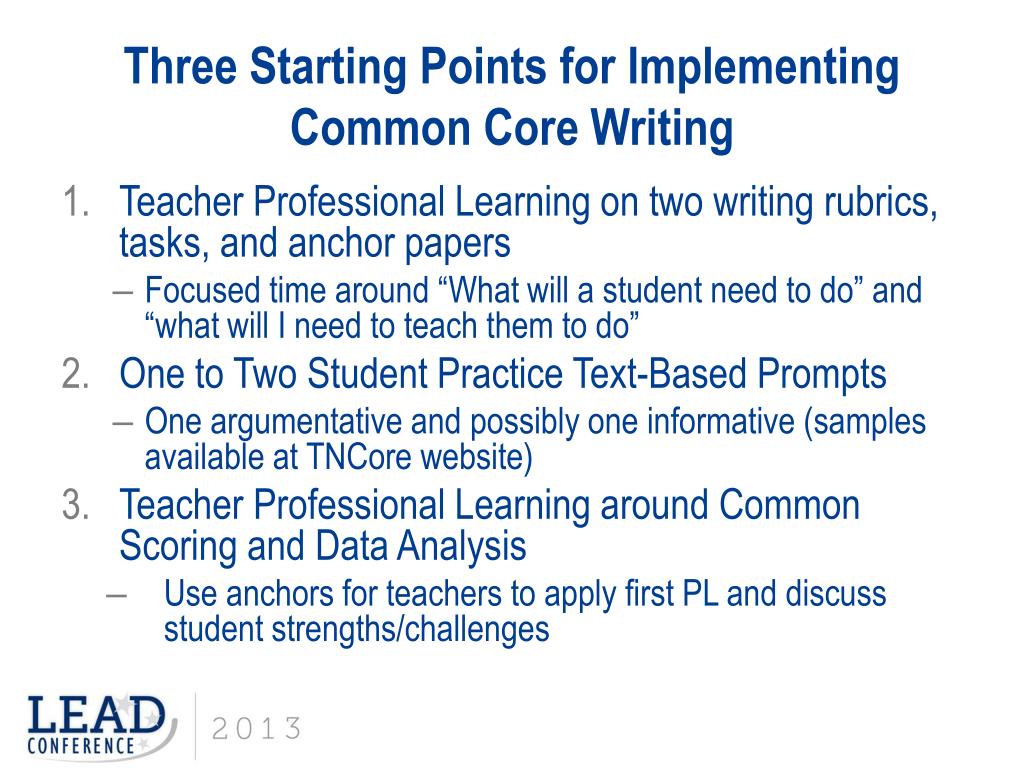 Three Starting Points for Implementing Common Core Writing • Teacher Professional Learning on two writing rubrics, tasks, and anchor papers • Focused time around “What will a student need to do” and “what will I need to teach them to do” • One to Two Student Practice Text-Based Prompts • One argumentative and possibly one informative (samples available at TNCore website) • Teacher Professional Learning around Common Scoring and Data Analysis • Use anchors for teachers to apply first PL and discuss student strengths/challenges