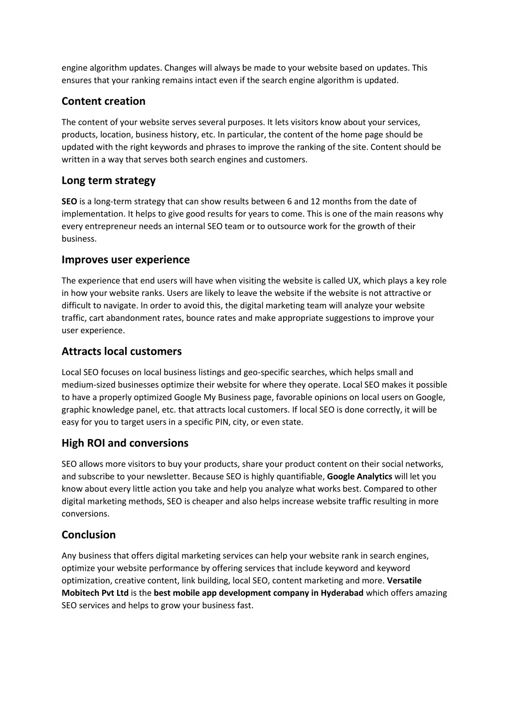 engine algorithm updates. Changes will always be made to your website based on updates. This ensures that your ranking remains intact even if the search engine algorithm is updated. Content creation The content of your website serves several purposes. It lets visitors know about your services, products, location, business history, etc. In particular, the content of the home page should be updated with the right keywords and phrases to improve the ranking of the site. Content should be written in a way that serves both search engines and customers. Long term strategy SEO is a long-term strategy that can show results between 6 and 12 months from the date of implementation. It helps to give good results for years to come. This is one of the main reasons why every entrepreneur needs an internal SEO team or to outsource work for the growth of their business. Improves user experience The experience that end users will have when visiting the website is called UX, which plays a key role in how your website ranks. Users are likely to leave the website if the website is not attractive or difficult to navigate. In order to avoid this, the digital marketing team will analyze your website traffic, cart abandonment rates, bounce rates and make appropriate suggestions to improve your user experience. Attracts local customers Local SEO focuses on local business listings and geo-specific searches, which helps small and medium-sized businesses optimize their website for where they operate. Local SEO makes it possible to have a properly optimized Google My Business page, favorable opinions on local users on Google, graphic knowledge panel, etc. that attracts local customers. If local SEO is done correctly, it will be easy for you to target users in a specific PIN, city, or even state. High ROI and conversions SEO allows more visitors to buy your products, share your product content on their social networks, and subscribe to your newsletter. Because SEO is highly quantifiable, Google Analytics will let you know about every little action you take and help you analyze what works best. Compared to other digital marketing methods, SEO is cheaper and also helps increase website traffic resulting in more conversions. Conclusion Any business that offers digital marketing services can help your website rank in search engines, optimize your website performance by offering services that include keyword and keyword optimization, creative content, link building, local SEO, content marketing and more. Versatile Mobitech Pvt Ltd is the best mobile app development company in Hyderabad which offers amazing SEO services and helps to grow your business fast.
