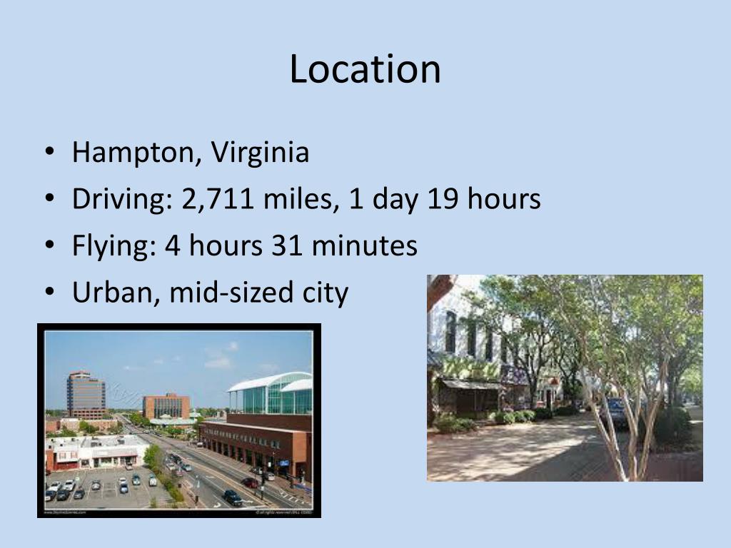 Location • Hampton, Virginia • Driving: 2,711 miles, 1 day 19 hours • Flying: 4 hours 31 minutes • Urban, mid-sized city