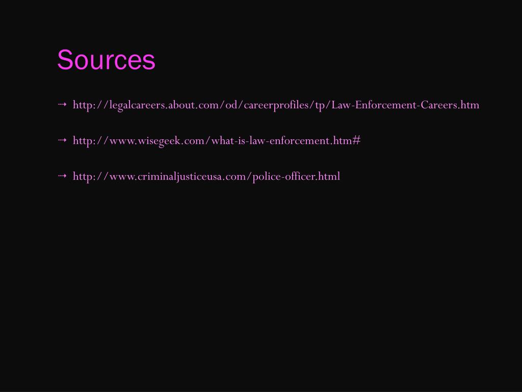 Sources • http://legalcareers.about.com/od/careerprofiles/tp/Law-Enforcement-Careers.htm • http://www.wisegeek.com/what-is-law-enforcement.htm# • http://www.criminaljusticeusa.com/police-officer.html