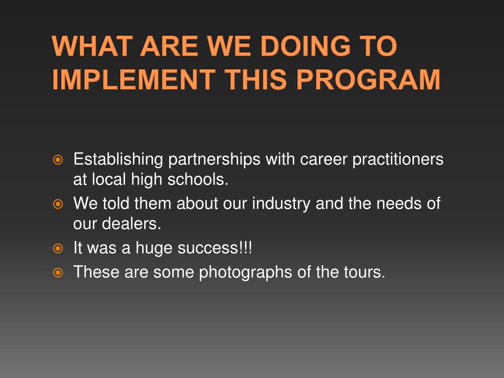WHAT ARE WE DOING TO IMPLEMENT THIS PROGRAM • Establishing partnerships with career practitioners at local high schools. • We told them about our industry and the needs of our dealers. • It was a huge success!!! • These are some photographs of the tours.