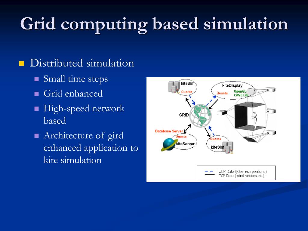 Grid computing based simulation • Distributed simulation • Small time steps • Grid enhanced • High-speed network based • Architecture of gird enhanced application to kite simulation