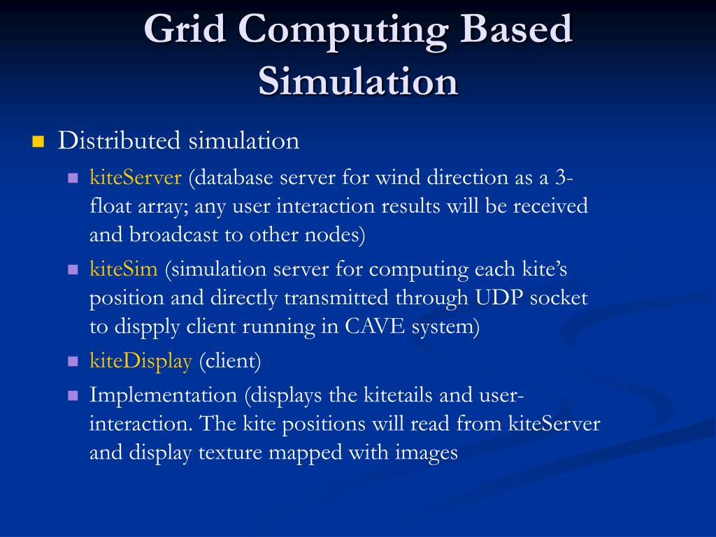 Grid Computing Based Simulation • Distributed simulation • kiteServer (database server for wind direction as a 3-float array; any user interaction results will be received and broadcast to other nodes) • kiteSim (simulation server for computing each kite’s position and directly transmitted through UDP socket to dispply client running in CAVE system) • kiteDisplay (client) • Implementation (displays the kitetails and user-interaction. The kite positions will read from kiteServer and display texture mapped with images
