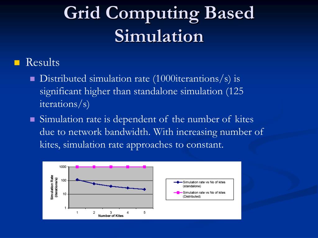 Grid Computing Based Simulation • Results • Distributed simulation rate (1000iterantions/s) is significant higher than standalone simulation (125 iterations/s) • Simulation rate is dependent of the number of kites due to network bandwidth. With increasing number of kites, simulation rate approaches to constant.