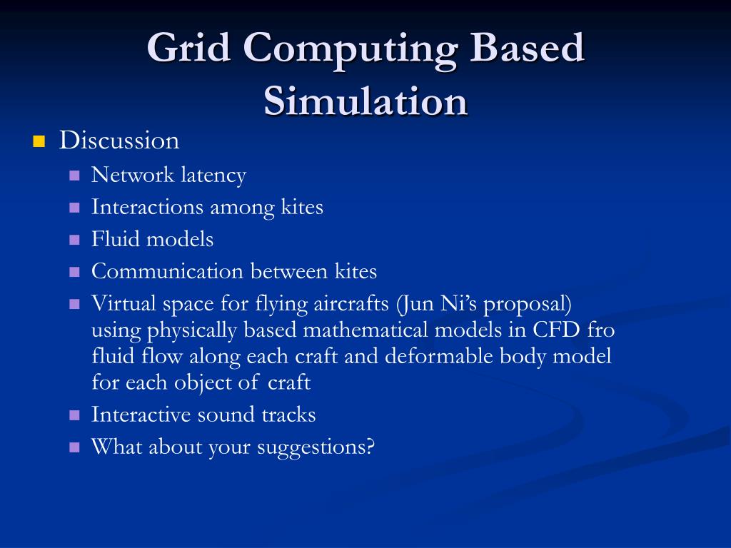 Grid Computing Based Simulation • Discussion • Network latency • Interactions among kites • Fluid models • Communication between kites • Virtual space for flying aircrafts (Jun Ni’s proposal) using physically based mathematical models in CFD fro fluid flow along each craft and deformable body model for each object of craft • Interactive sound tracks • What about your suggestions?