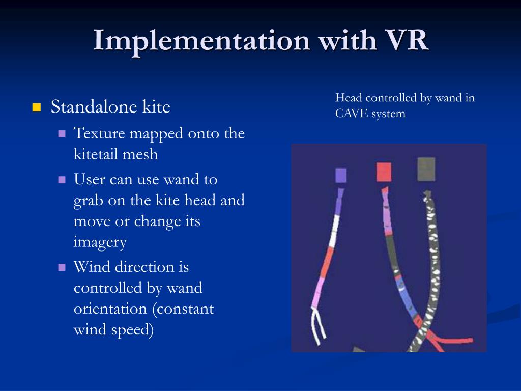 Implementation with VR Head controlled by wand in CAVE system • Standalone kite • Texture mapped onto the kitetail mesh • User can use wand to grab on the kite head and move or change its imagery • Wind direction is controlled by wand orientation (constant wind speed)