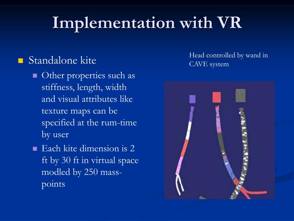 Implementation with VR Head controlled by wand in CAVE system • Standalone kite • Other properties such as stiffness, length, width and visual attributes like texture maps can be specified at the rum-time by user • Each kite dimension is 2 ft by 30 ft in virtual space modled by 250 mass-points