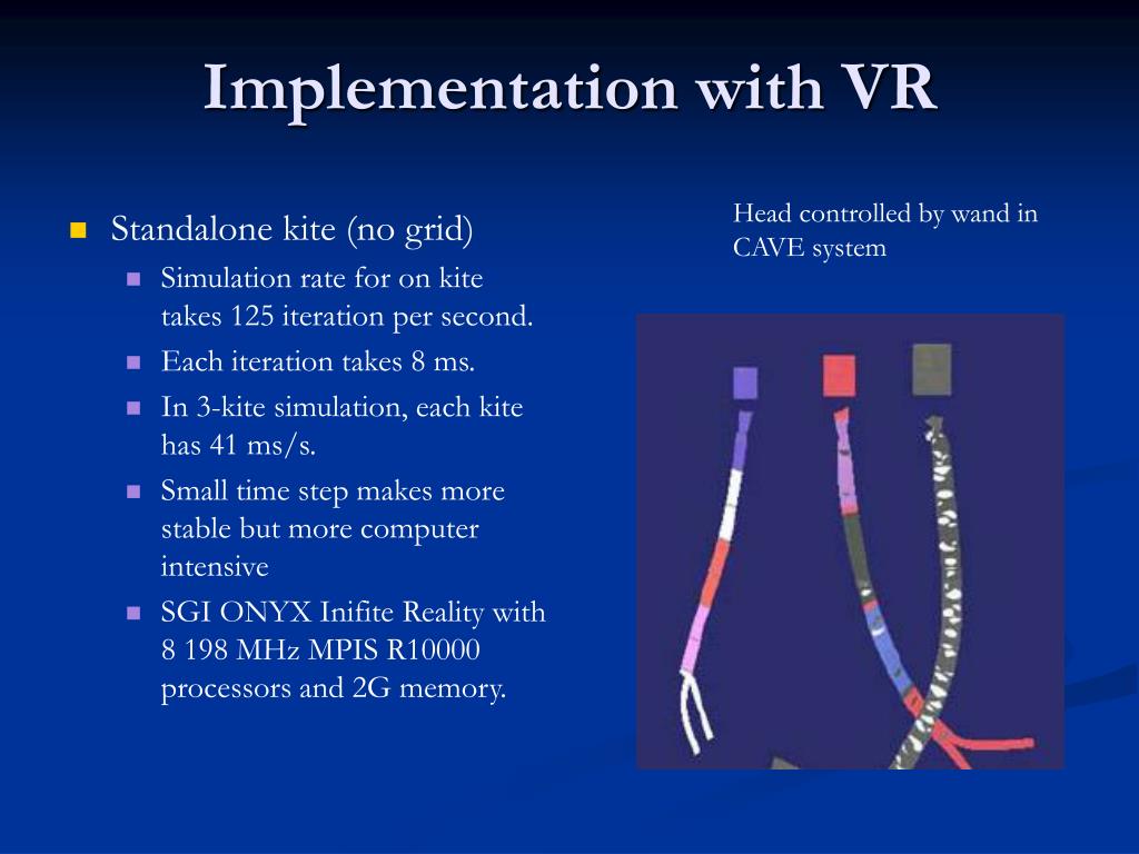 Implementation with VR Head controlled by wand in CAVE system • Standalone kite (no grid) • Simulation rate for on kite takes 125 iteration per second. • Each iteration takes 8 ms. • In 3-kite simulation, each kite has 41 ms/s. • Small time step makes more stable but more computer intensive • SGI ONYX Inifite Reality with 8 198 MHz MPIS R10000 processors and 2G memory.