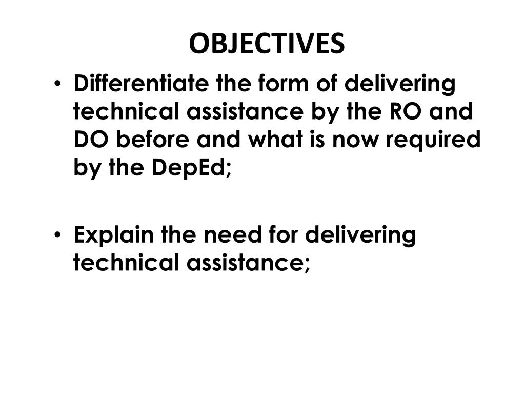 Technical Assistance. OBJECTIVES. Differentiate the form of delivering technical assistance by the RO and DO before and what is now required by the DepEd ; Explain the need for delivering technical assistance;. OBJECTIVES. Explain the Technical Assistance Mechanism process framework; and