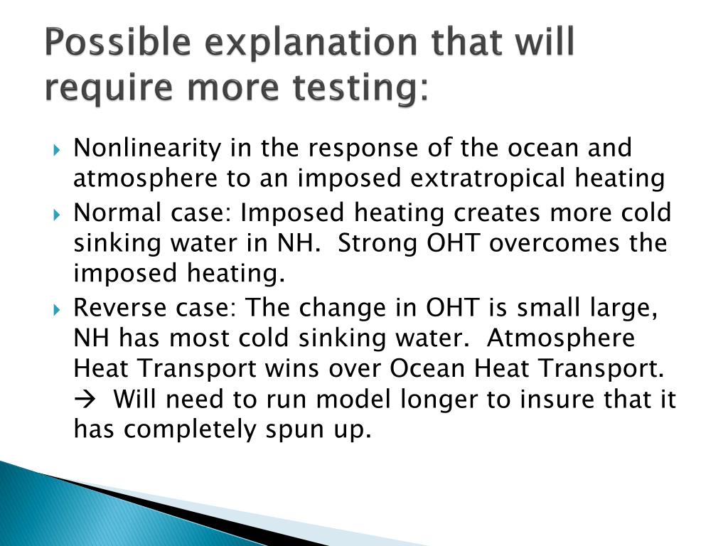 Possible explanation that will require more testing: • Nonlinearity in the response of the ocean and atmosphere to an imposed extratropical heating • Normal case: Imposed heating creates more cold sinking water in NH. Strong OHT overcomes the imposed heating. • Reverse case: The change in OHT is small large, NH has most cold sinking water. Atmosphere Heat Transport wins over Ocean Heat Transport. Will need to run model longer to insure that it has completely spun up.