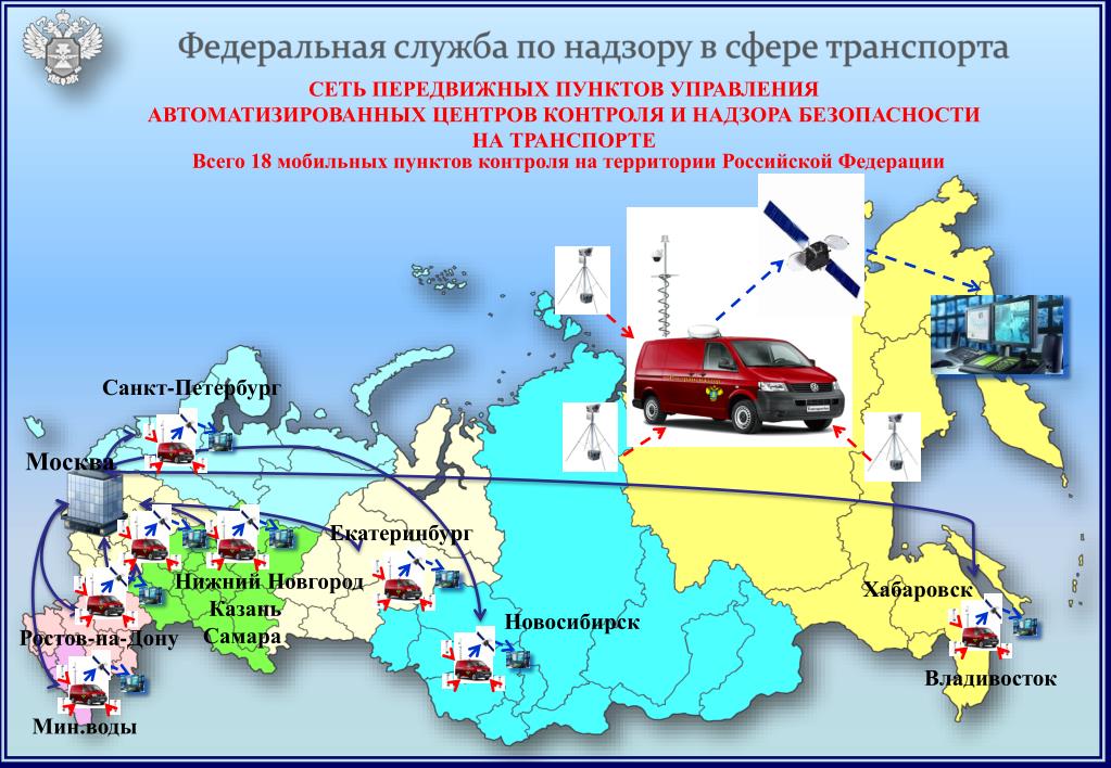 СЕТЬ ПЕРЕДВИЖНЫХ ПУНКТОВ УПРАВЛЕНИЯ АВТОМАТИЗИРОВАННЫХ ЦЕНТРОВ КОНТРОЛЯ И НАДЗОРА БЕЗОПАСНОСТИ НА ТРАНСПОРТЕ Всего 18 мобильных пунктов контроля на территории Российской Федерации Санкт-Петербург Ространснадзор Ространснадзор Москва Екатеринбург Нижний Новгород Казань Самара Хабаровск Новосибирск Ростов-на-Дону Владивосток Мин.воды