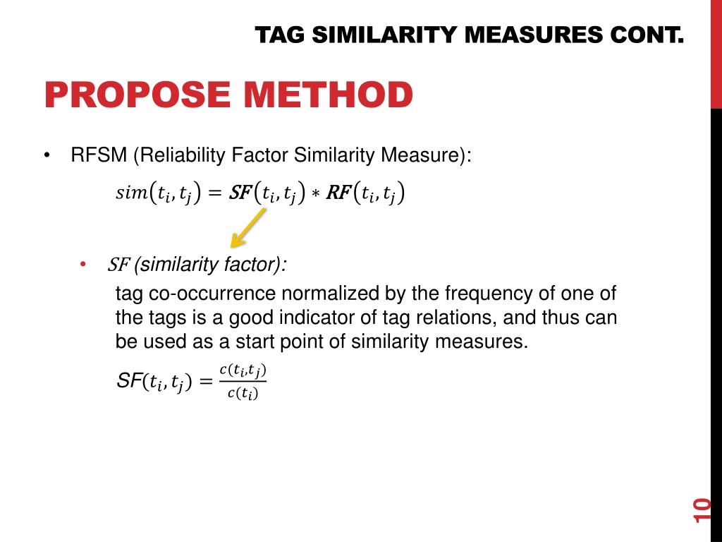 Tag similarity measures cont. Propose method • RFSM (Reliability Factor Similarity Measure): • (similarity factor): tag co-occurrence normalized by the frequency of one of the tags is a good indicator of tag relations, and thus can be used as a start point of similarity measures. SF