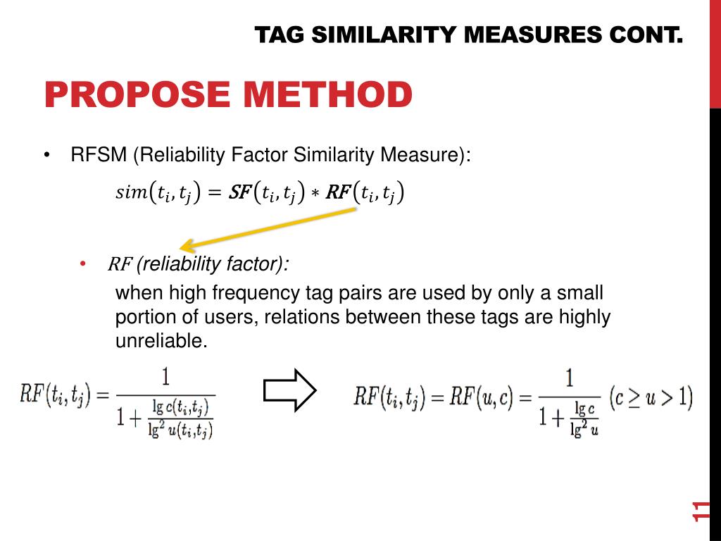 Tag similarity measures cont. Propose method • RFSM (Reliability Factor Similarity Measure): • (reliability factor): when high frequency tag pairs are used by only a small portion of users, relations between these tags are highly unreliable.