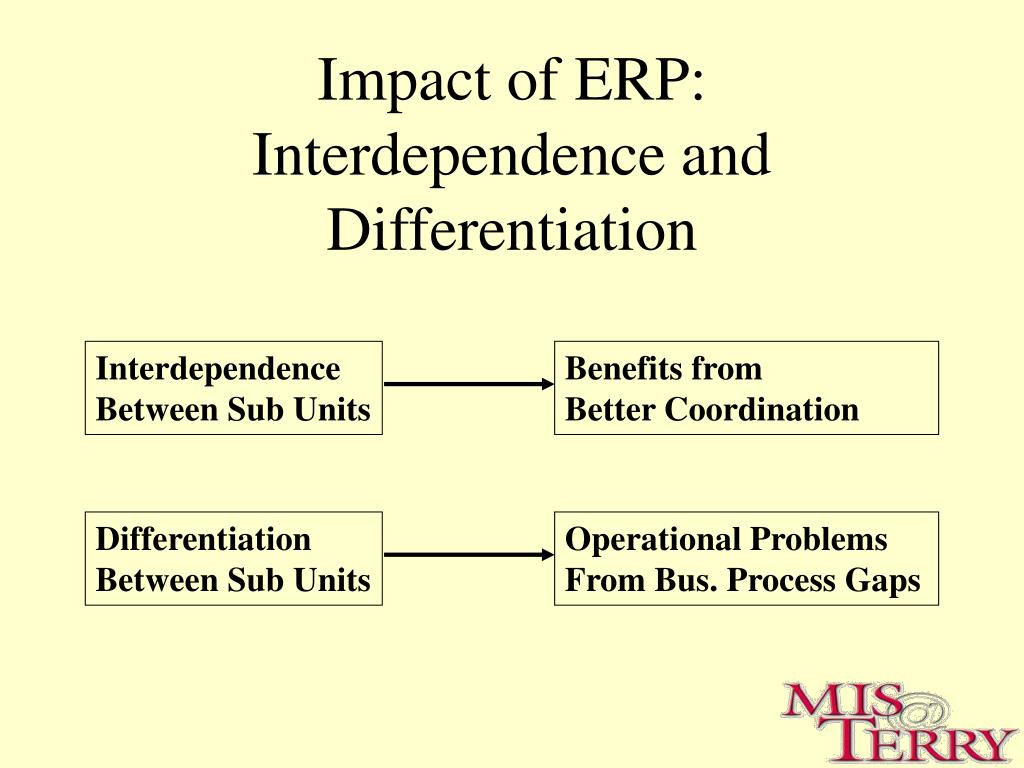 Impact of ERP: Interdependence and Differentiation Interdependence Between Sub Units Benefits from Better Coordination Differentiation Between Sub Units Operational Problems From Bus. Process Gaps