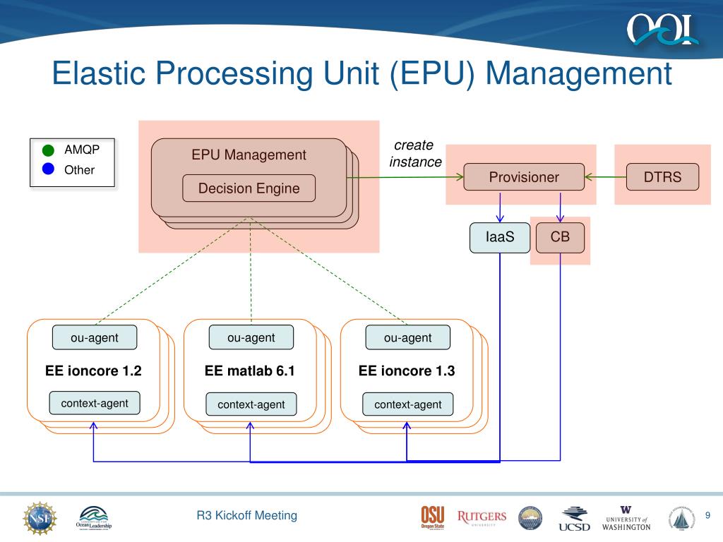 Elastic Processing Unit (EPU) Management create instance AMQP EPU Management EPU Management EPU Management Other Provisioner DTRS Decision Engine IaaS CB EE ioncore 1.2 EE matlab 6.1 EE ioncore 1.3 ou-agent ou-agent ou-agent context-agent context-agent context-agent