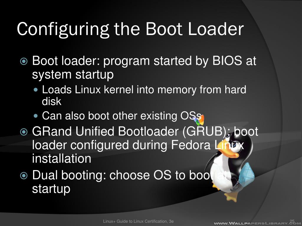 Configuring the Boot Loader • Boot loader: program started by BIOS at system startup • Loads Linux kernel into memory from hard disk • Can also boot other existing OSs • GRand Unified Bootloader (GRUB): boot loader configured during Fedora Linux installation • Dual booting: choose OS to boot at startup Linux+ Guide to Linux Certification, 3e