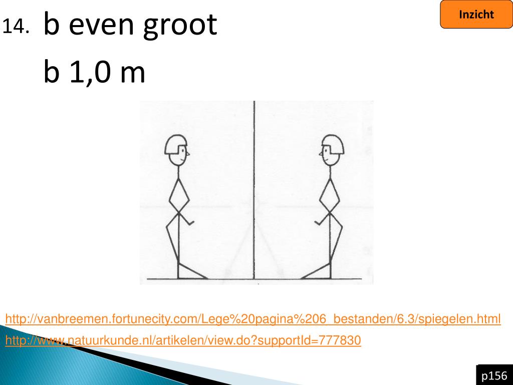 b even groot Inzicht 14. b 1,0 m http://vanbreemen.fortunecity.com/Lege%20pagina%206_bestanden/6.3/spiegelen.html http://www.natuurkunde.nl/artikelen/view.do?supportId=777830 p155 p156