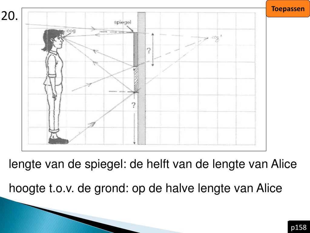 Toepassen 20. • lengte van de spiegel: de helft van de lengte van Alice • hoogte t.o.v. de grond: op de halve lengte van Alice p155 p158