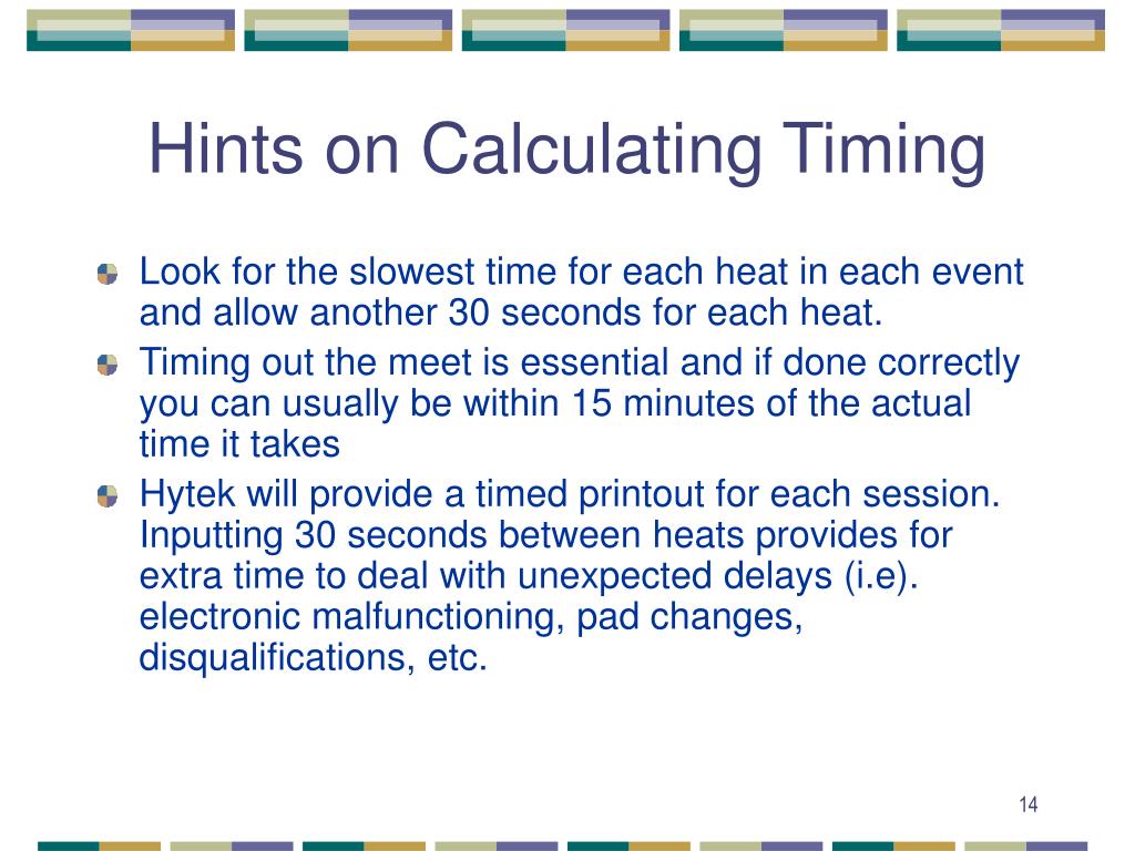 Hints on Calculating Timing • Look for the slowest time for each heat in each event and allow another 30 seconds for each heat. • Timing out the meet is essential and if done correctly you can usually be within 15 minutes of the actual time it takes • Hytek will provide a timed printout for each session. Inputting 30 seconds between heats provides for extra time to deal with unexpected delays (i.e). electronic malfunctioning, pad changes, disqualifications, etc.