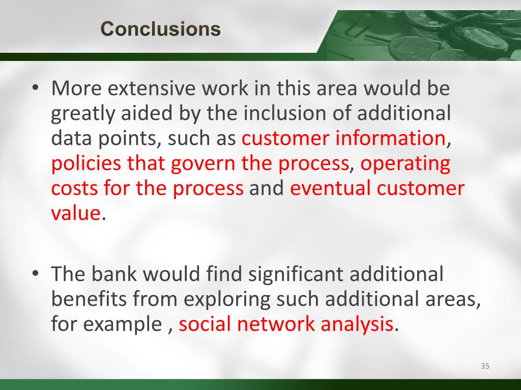 Conclusions • More extensive work in this area would be greatly aided by the inclusion of additional data points, such as customer information, policies that govern the process, operating costs for the process and eventual customer value. • The bank would find significant additional benefits from exploring such additional areas, for example , social network analysis.
