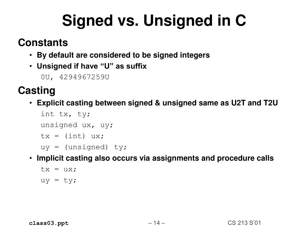 Why Should I Use Unsigned? • Don’t Use Just Because Number is Never Negative • C compiler on Alpha generates less efficient code • Comparable code on Intel/Linux unsigned i; for (i = 1; i < cnt; i++) a[i] += a[i-1]; • Easy to make mistakes for (i = cnt-2; i >= 0; i--) a[i] += a[i+1]; • Do Use When Performing Modular Arithmetic • Multiprecision arithmetic • Other esoteric stuff • Do Use When Need Extra Bit’s Worth of Range • Working right up to limit of word size