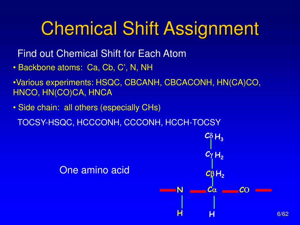 Chemical Shift Assignment Find out Chemical Shift for Each Atom • Backbone atoms: Ca, Cb, C’, N, NH • Various experiments: HSQC, CBCANH, CBCACONH, HN(CA)CO, HNCO, HN(CO)CA, HNCA • Side chain: all others (especially CHs) • TOCSY-HSQC, HCCCONH, CCCONH, HCCH-TOCSY Cd H3 Cg H2 One amino acid Cb H2 Ca N CO H H