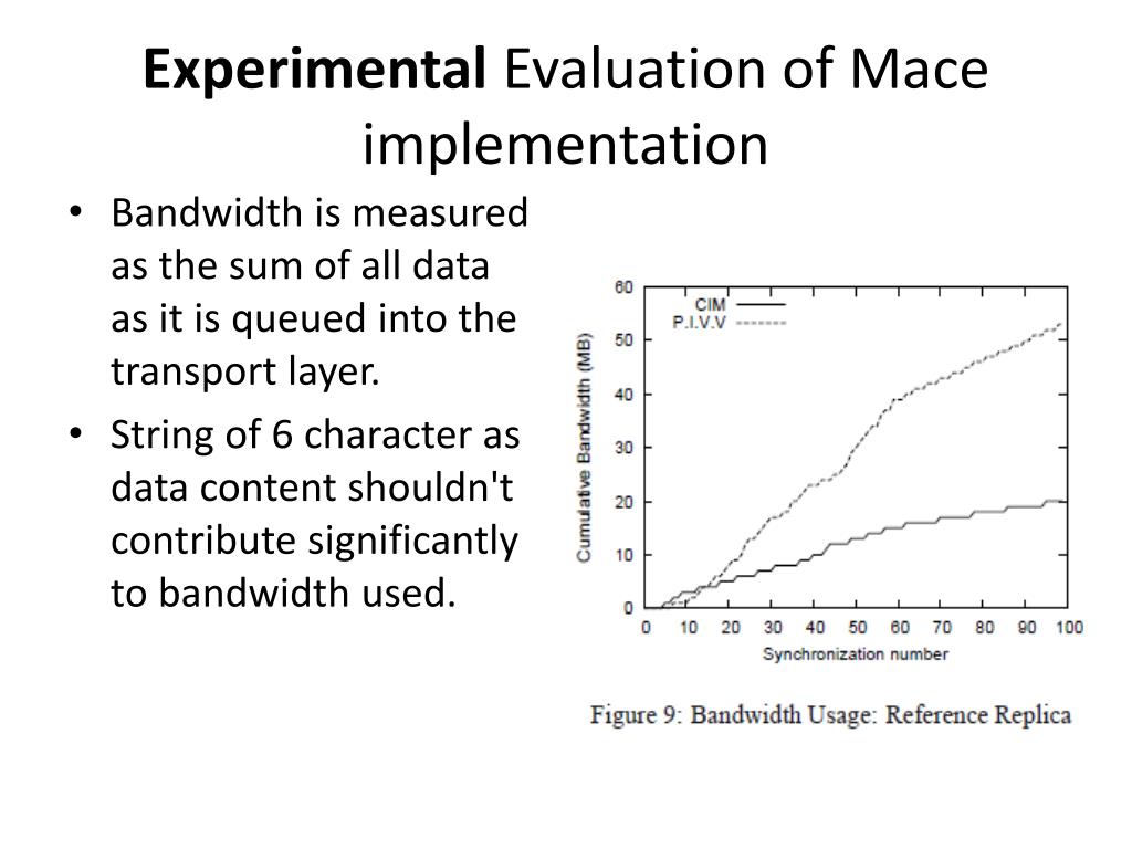 Experimental Evaluation of Mace implementation • Bandwidth is measured as the sum of all data as it is queued into the transport layer. • String of 6 character as data content shouldn't contribute significantly to bandwidth used.