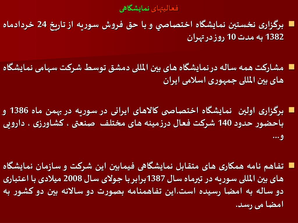 فعالیتهای نمایشگاهی • برگزاری نخستین نمايشگاه اختصاصي و با حق فروش سوريه از تاريخ 24 خردادماه 1382 به مدت 10 روز در تهران • مشارکت همه ساله در نمایشگاه های بین المللی دمشق توسط شرکت سهامی نمایشگاه های بین المللی جمهوری اسلامی ایران • برگزاری اولین نمایشگاه اختصاصی کالاهای ایرانی در سوریه در بهمن ماه 1386 و باحضور حدود 140 شرکت فعال درزمینه های مختلف صنعتی ، کشاورزی ، دارویی و... • تفاهم نامه همکاری های متقابل نمایشگاهی فیمابین این شرکت و سازمان نمایشگاه های بین المللی سوریه در تیرماه سال 1387برابر با جولای سال 2008 میلادی با اعتباری دو ساله به امضا رسیده است.این تفاهمنامه بصورت دو سالانه بین دو کشور به امضا می رسد.
